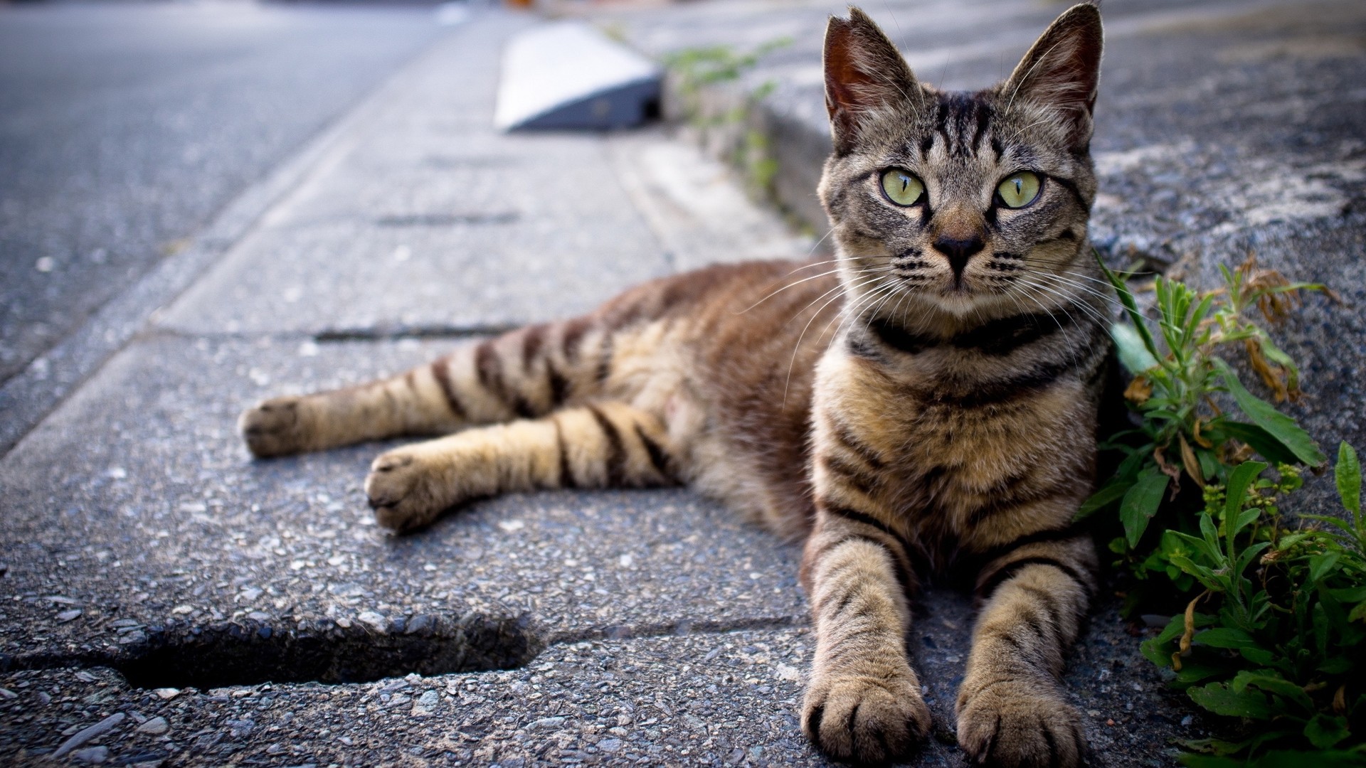Gray Striped Cat Street Road Wallpaper - 1920x1080