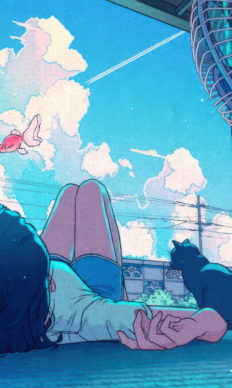 Anime Girl Black Cat Magical Clouds Wallpaper - 480x800