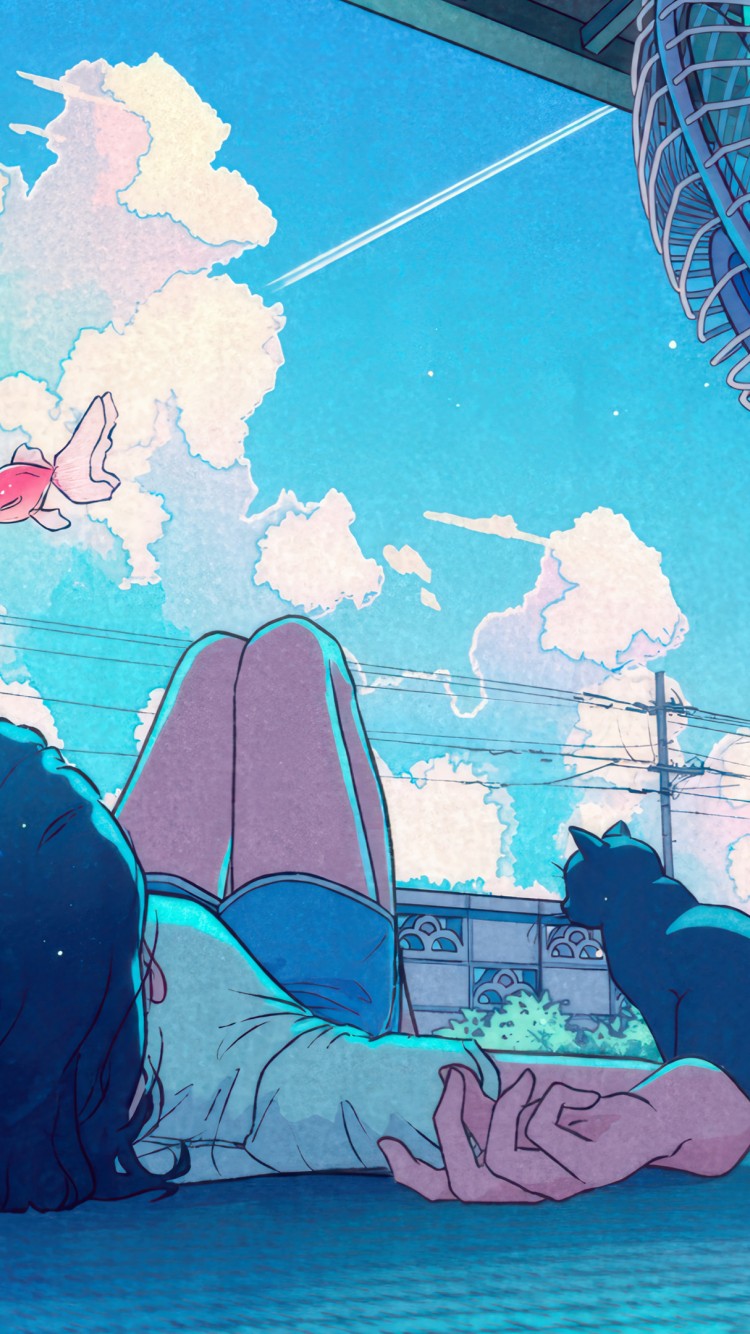 Anime Girl Black Cat Magical Clouds Wallpaper - 750x1334