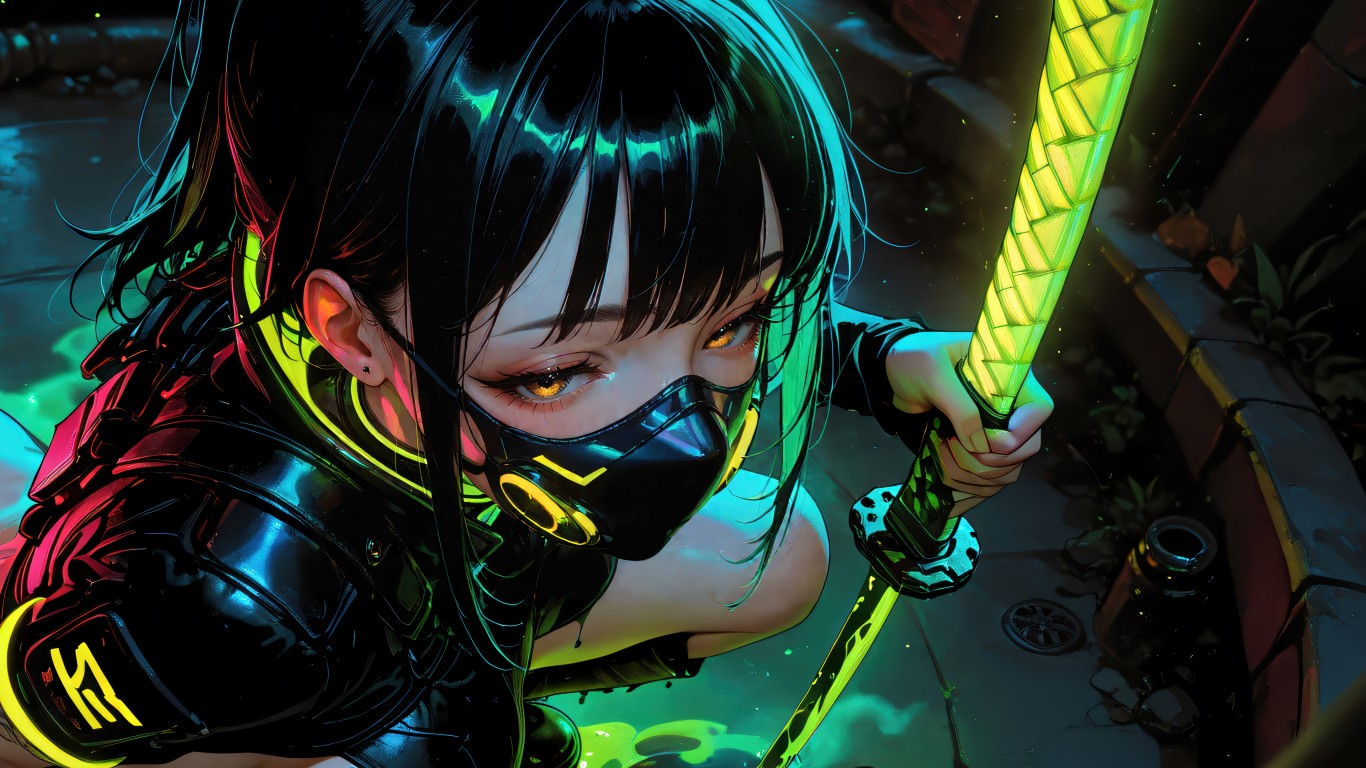 Anime Girl Mask Katana Sword Ai Art Wallpaper - 1366x768