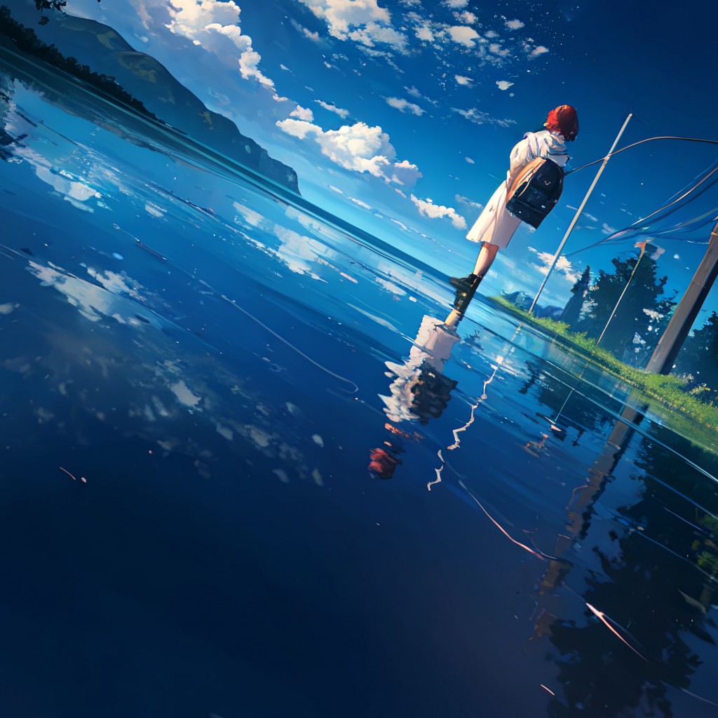 Anime Girl Water Reflection Clouds Scenery Wallpaper - 1024x1024