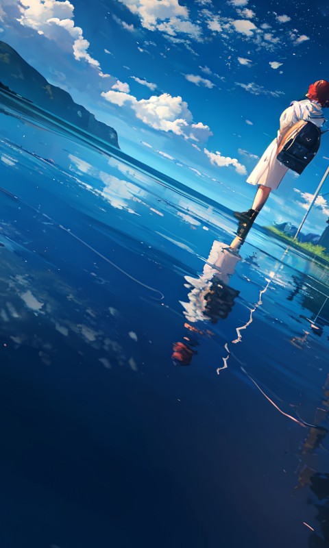 Anime Girl Water Reflection Clouds Scenery Wallpaper - 480x800