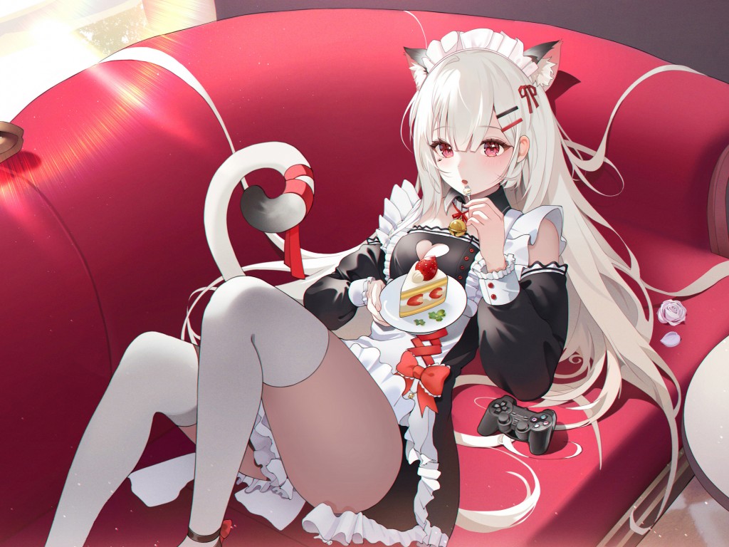 Anime Girl White Hair Fruit Cake Wallpaper - 1024x768