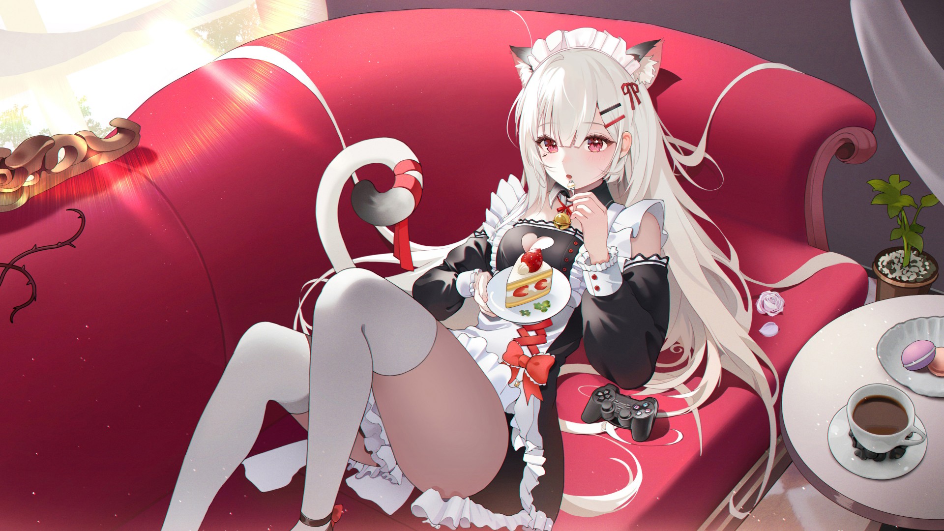 Anime Girl White Hair Fruit Cake Wallpaper - 1920x1080