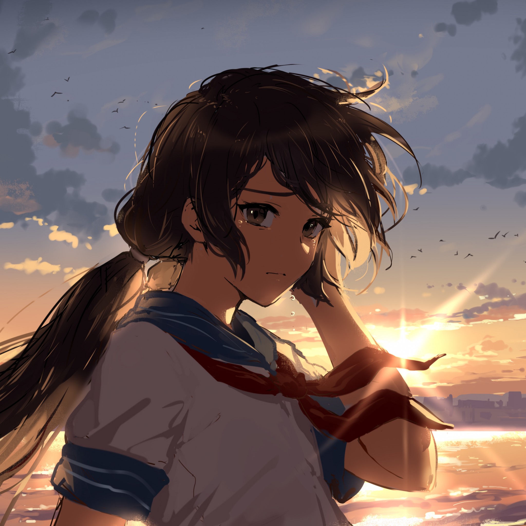 Brunette Anime Girl Sky Scenery Wallpaper - 2048x2048