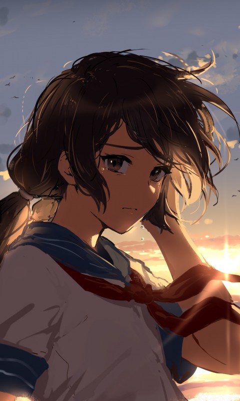 Brunette Anime Girl Sky Scenery Wallpaper - 480x800