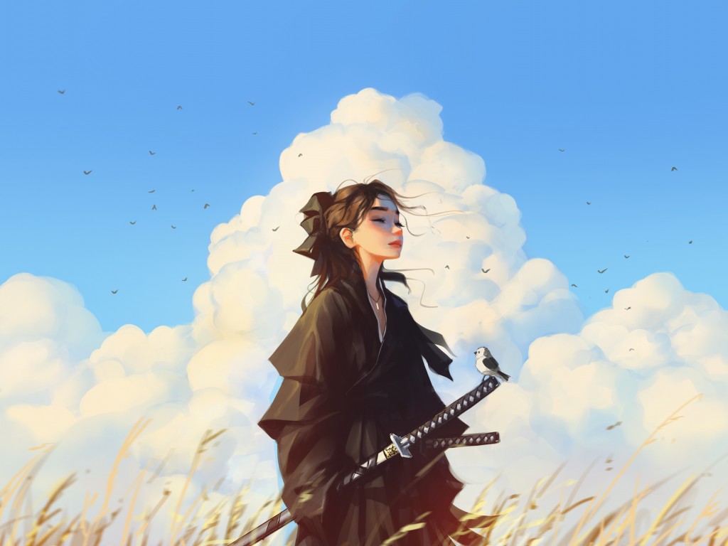 Samurai Girl Clouds Field Artwork Wallpaper - 1024x768