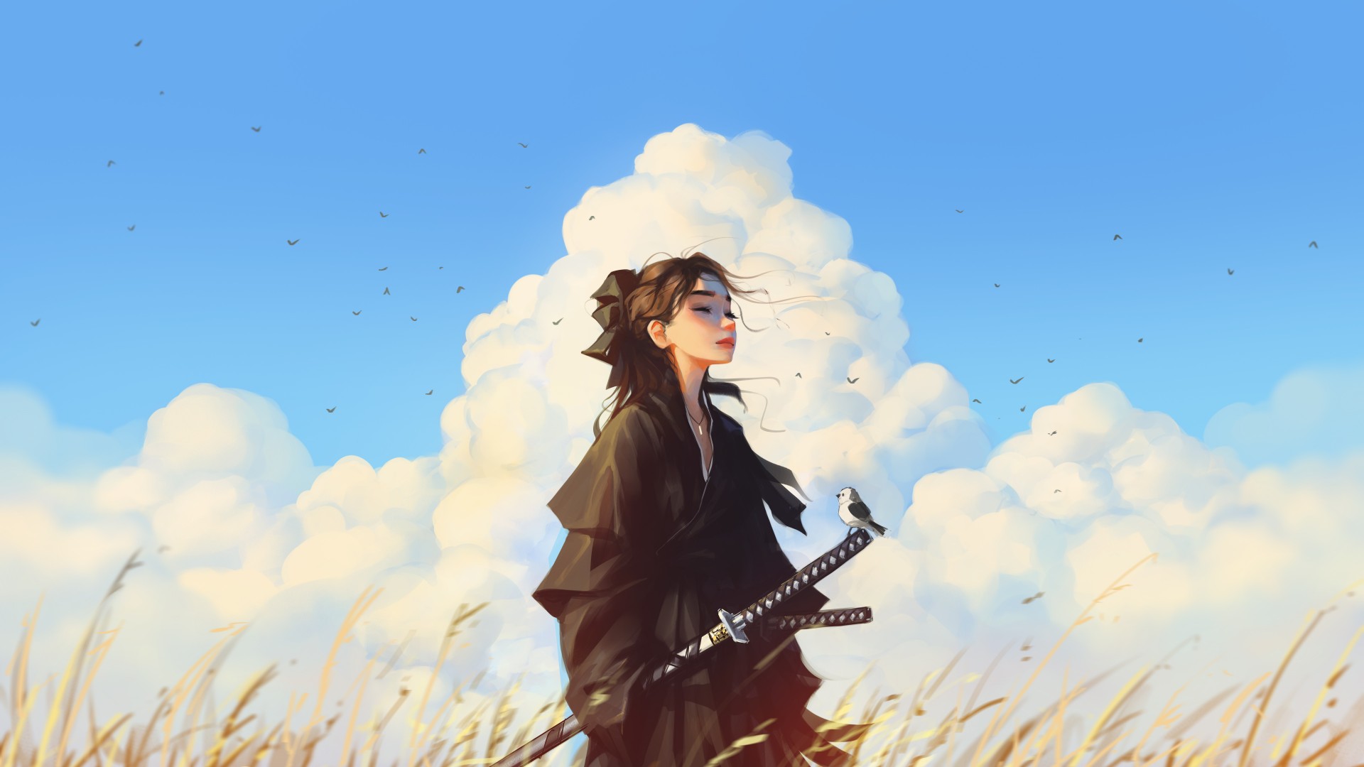 Samurai Girl Clouds Field Artwork Wallpaper - 1920x1080