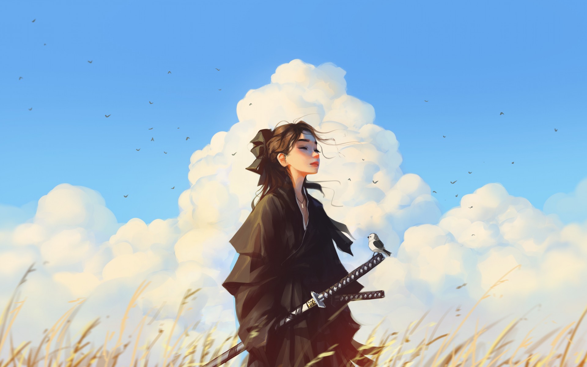 Samurai Girl Clouds Field Artwork Wallpaper - 1920x1200