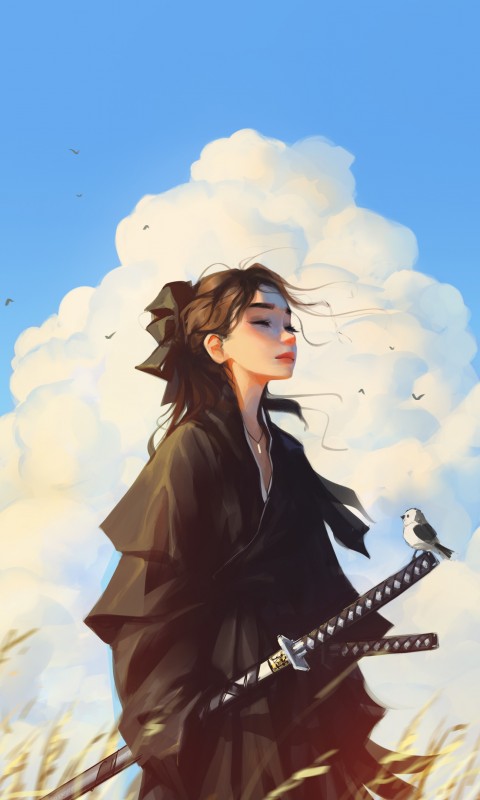 Samurai Girl Clouds Field Artwork Wallpaper - 480x800