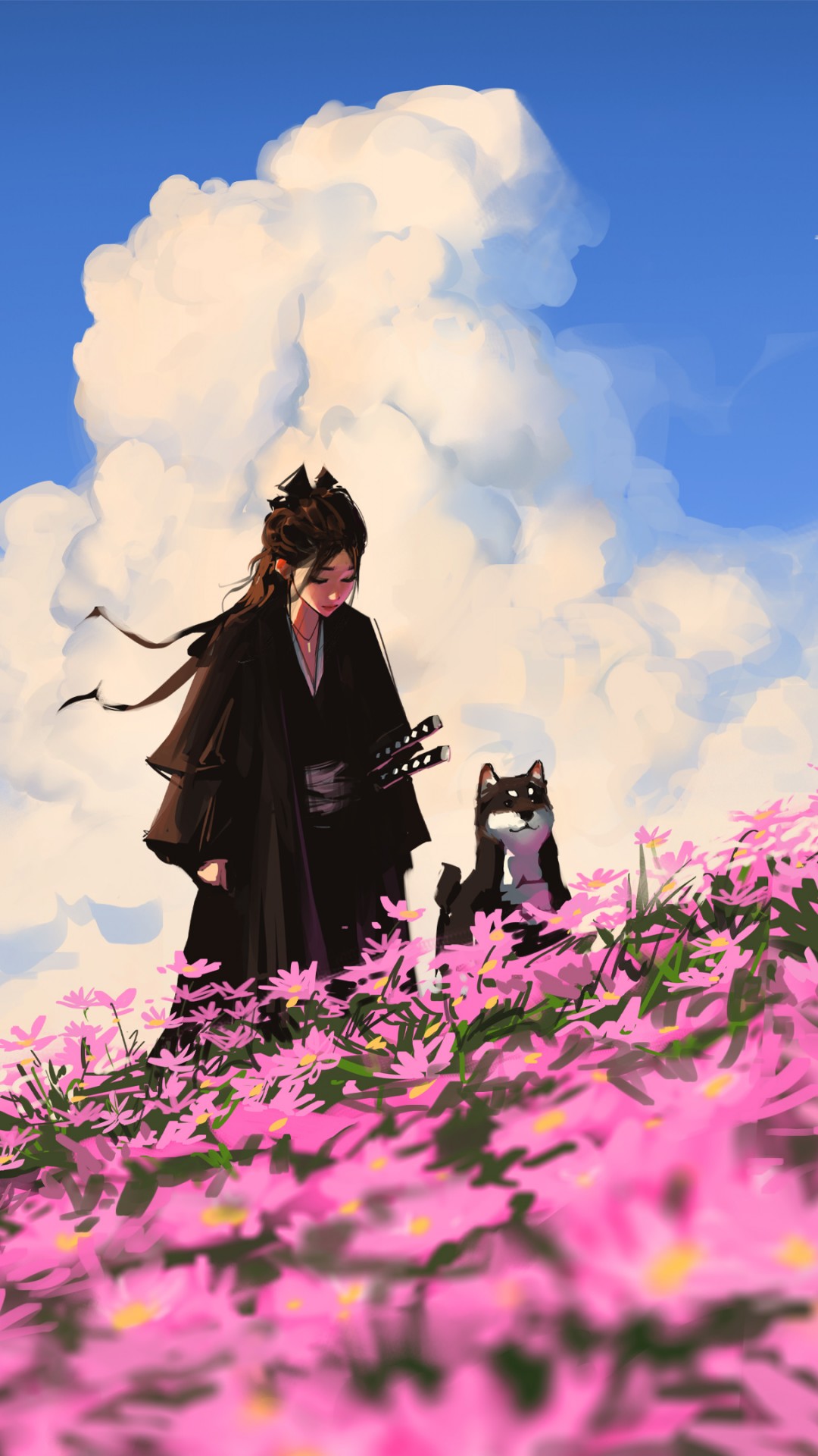 Samurai Girl Clouds Flower Field Wallpaper - 1080x1920