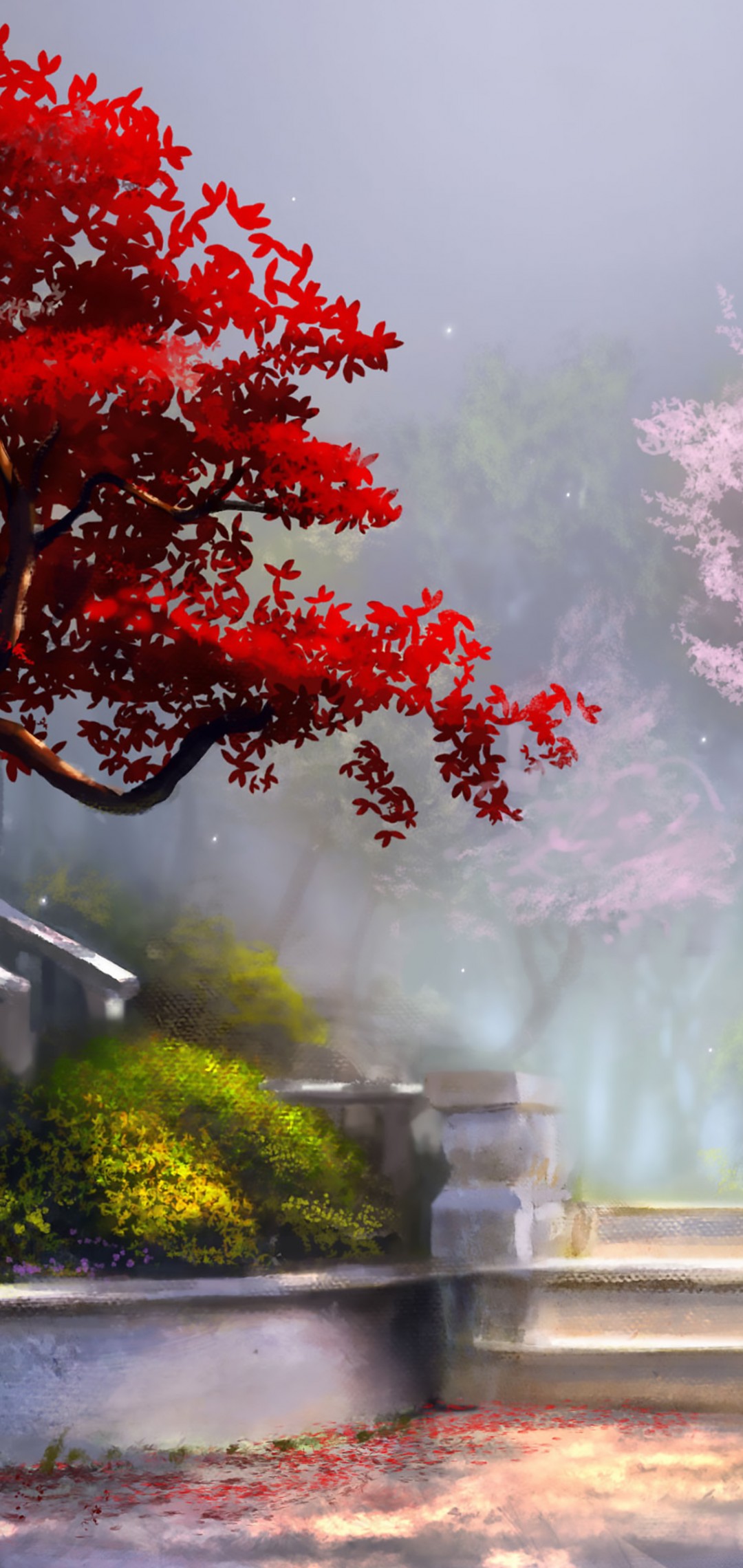 Art Painting Red Bonsai Tree Garden Wallpaper - 1080x2280