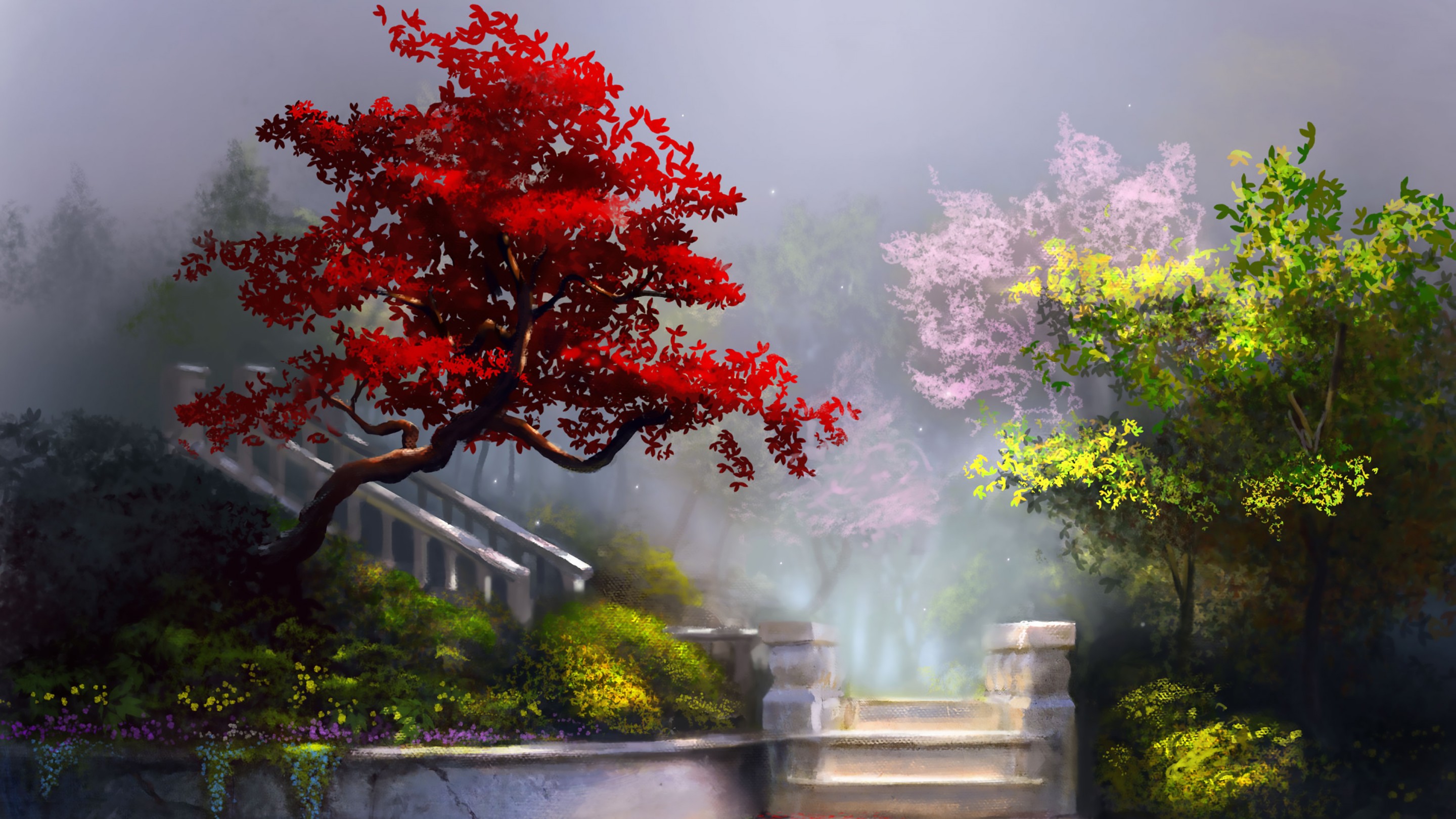 Art Painting Red Bonsai Tree Garden Wallpaper - 2880x1620