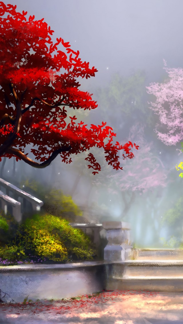 Art Painting Red Bonsai Tree Garden Wallpaper - 640x1136