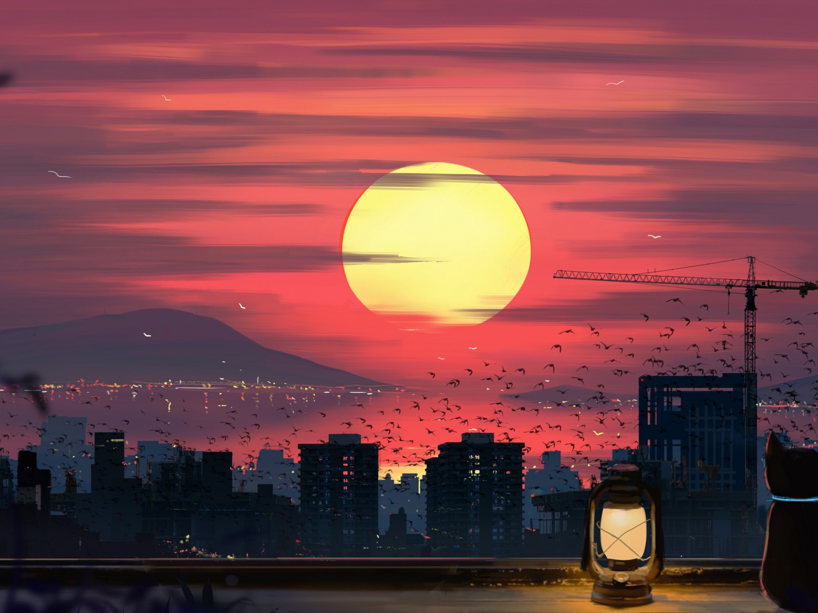 Cat Lantern Sunset Cityscape Scenery Wallpaper - 1600x1200
