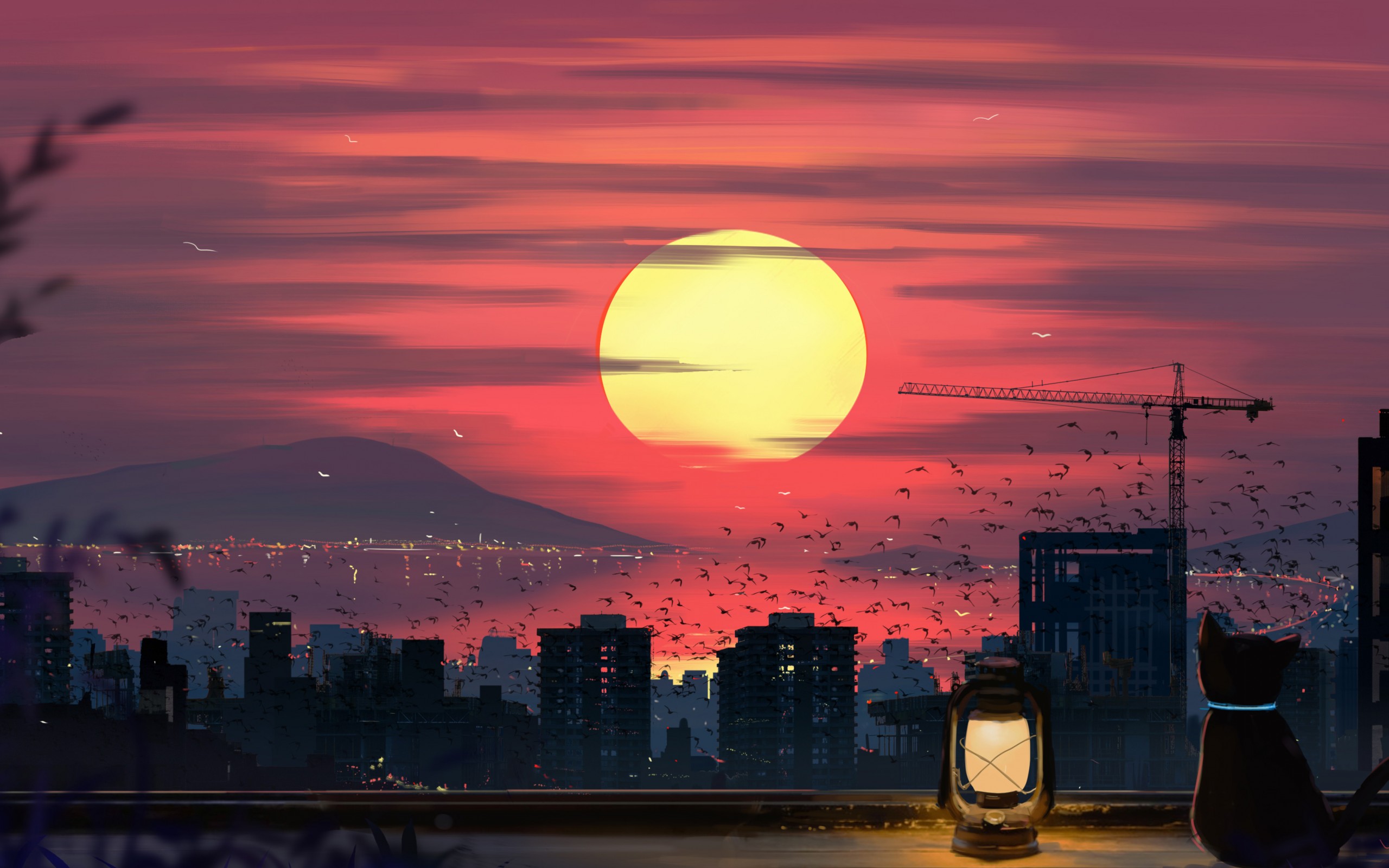 Cat Lantern Sunset Cityscape Scenery Wallpaper - 2560x1600