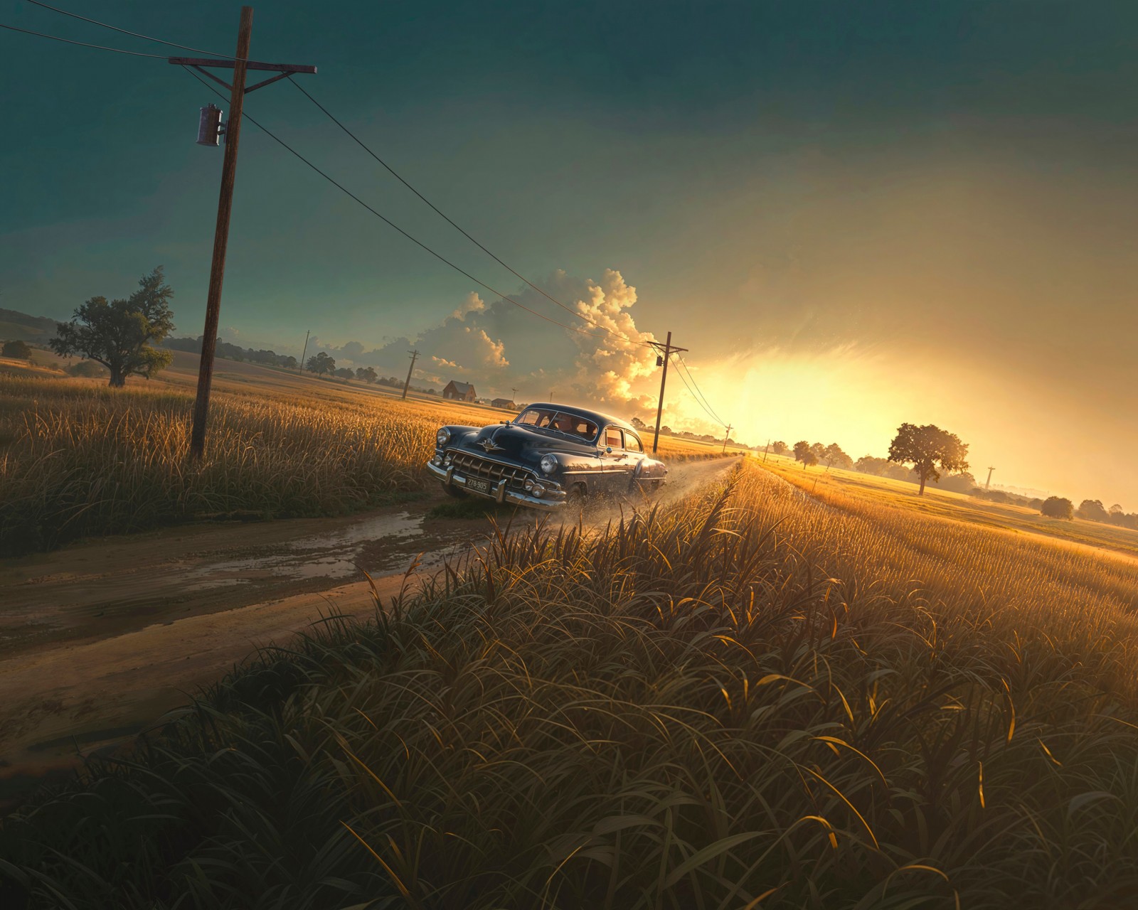 Classic Car Road Field Clouds Art Wallpaper - 1600x1280