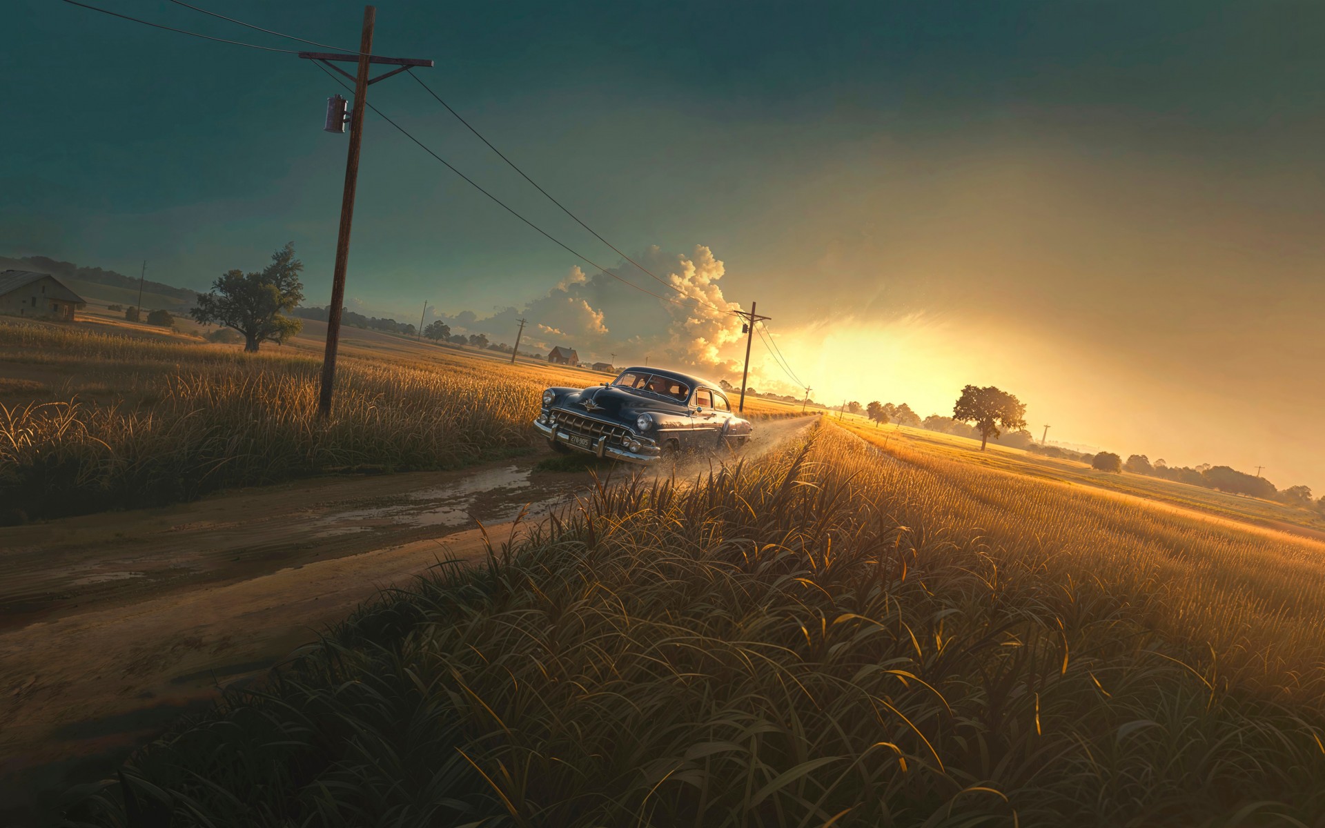 Classic Car Road Field Clouds Art Wallpaper - 1920x1200
