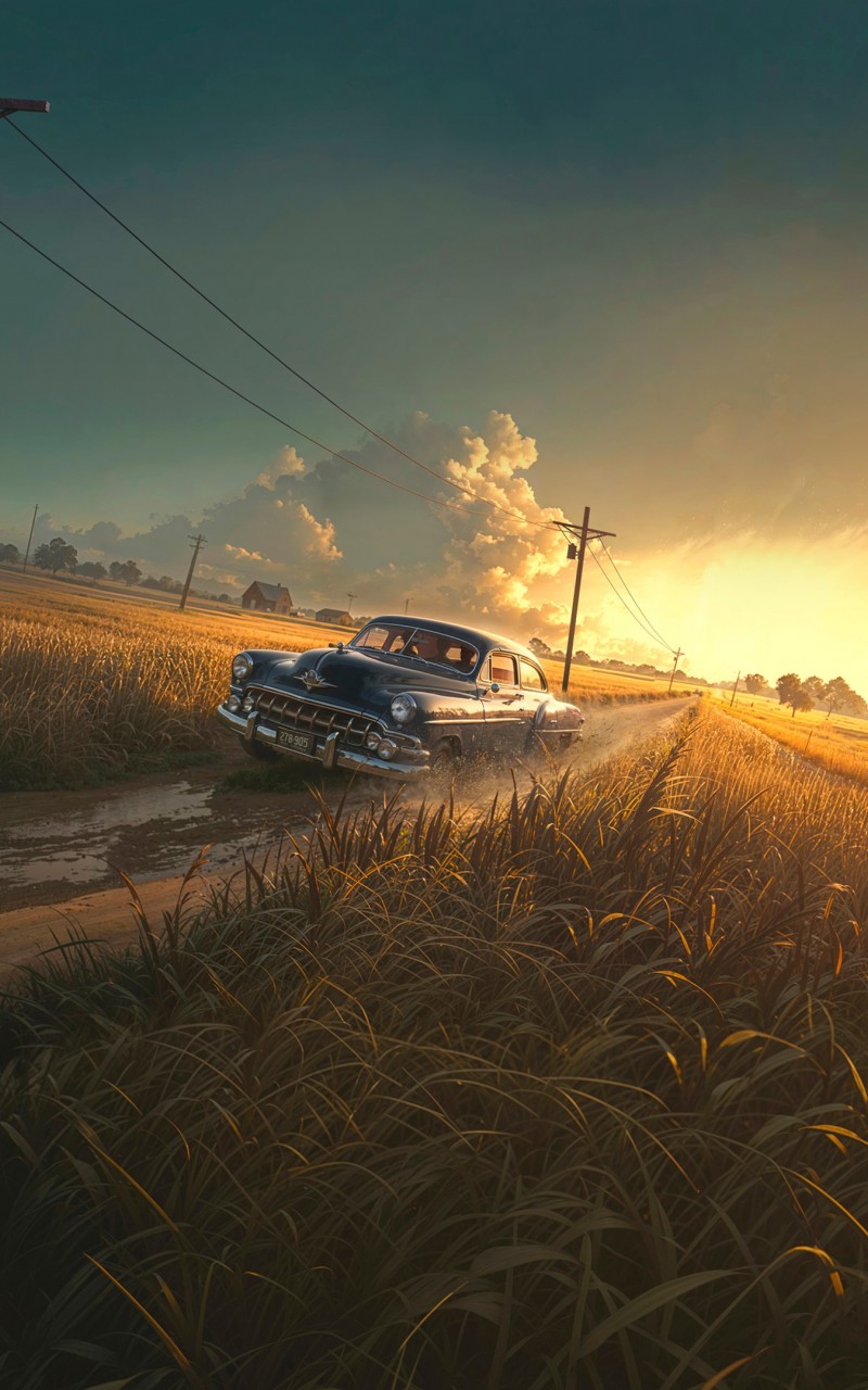 Classic Car Road Field Clouds Art Wallpaper - 800x1280