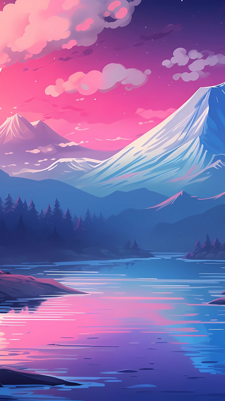 Full Moon Mountains Pink Clouds Art Wallpaper - 750x1334