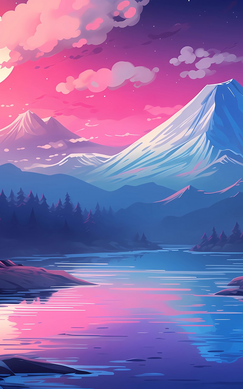 Full Moon Mountains Pink Clouds Art Wallpaper - 800x1280