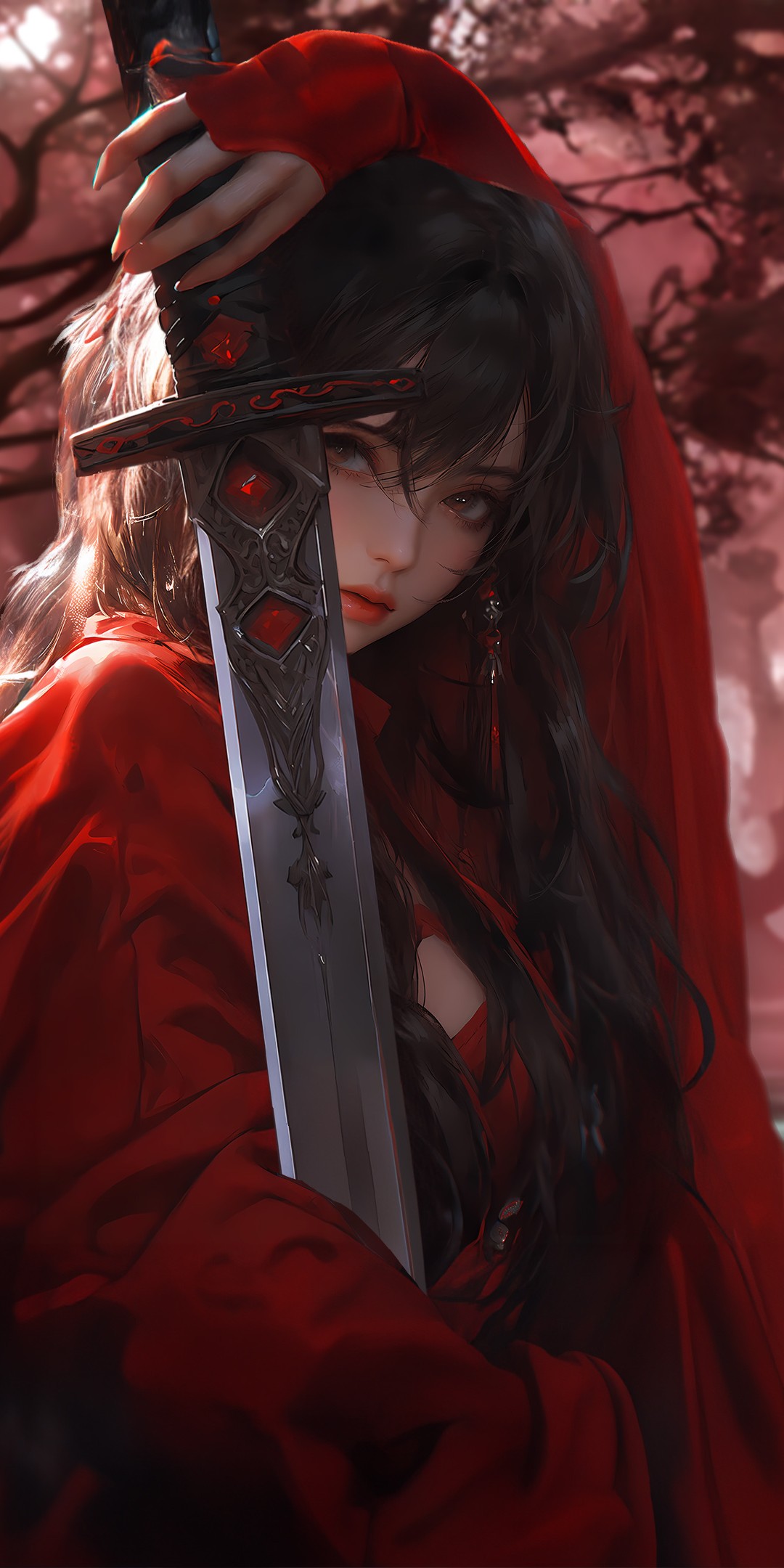 Girl Samurai Sword Red Kimono Wallpaper - 1080x2160