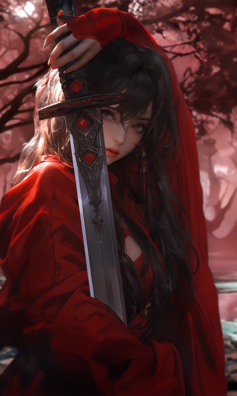 Girl Samurai Sword Red Kimono Wallpaper - 480x800