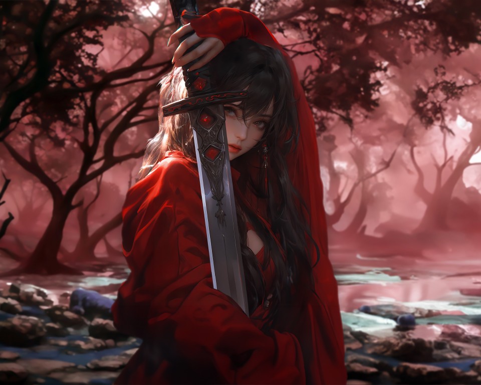 Girl Samurai Sword Red Kimono Wallpaper - 960x768