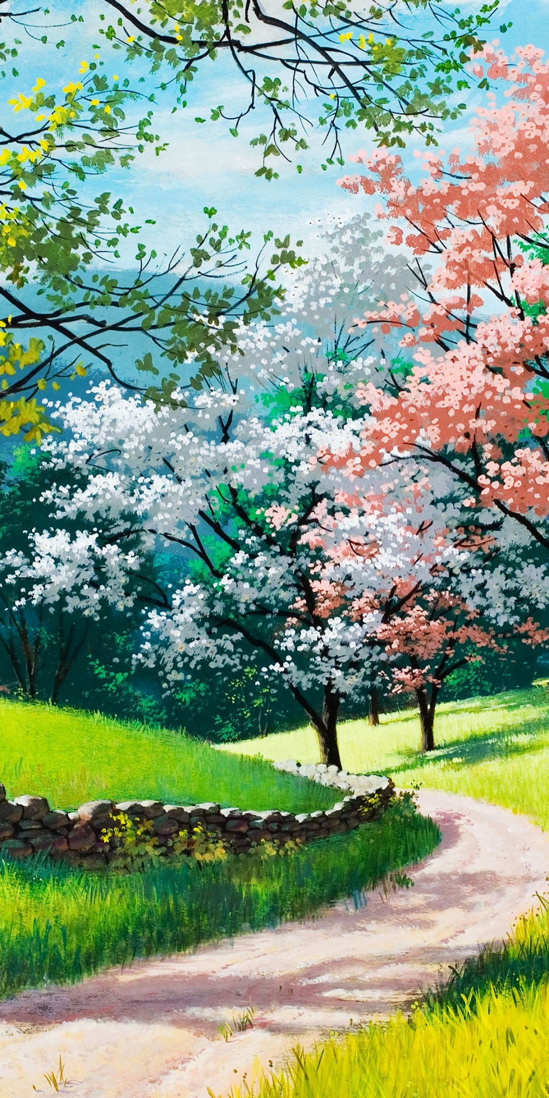 Green Grass Spring Trees Road Painting Wallpaper - 1080x2160