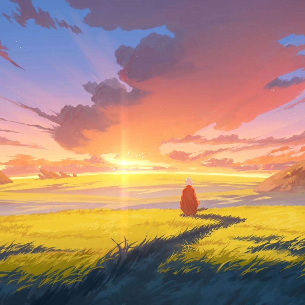 Landscape Field Sunset Sky Digital Art Wallpaper - 1024x1024