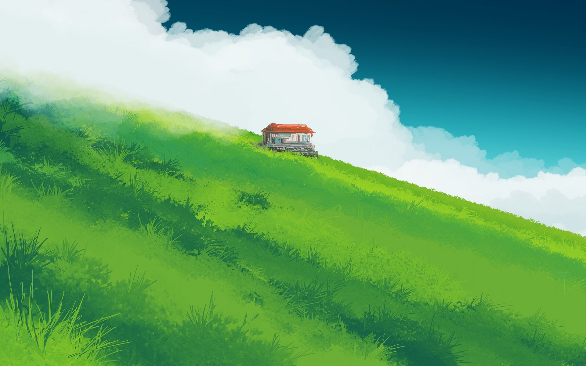 Minimalist Green Field House Clouds Wallpaper - 1920x1200