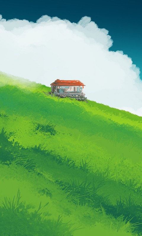 Minimalist Green Field House Clouds Wallpaper - 480x800