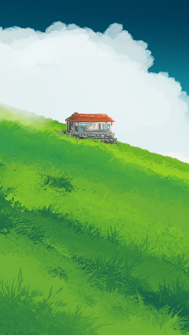 Minimalist Green Field House Clouds Wallpaper - 640x1136