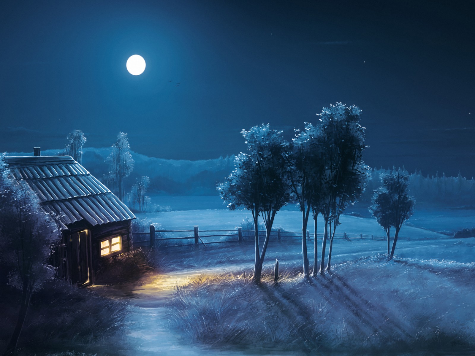 Nature Blue Night House Moon Wallpaper - 1600x1200