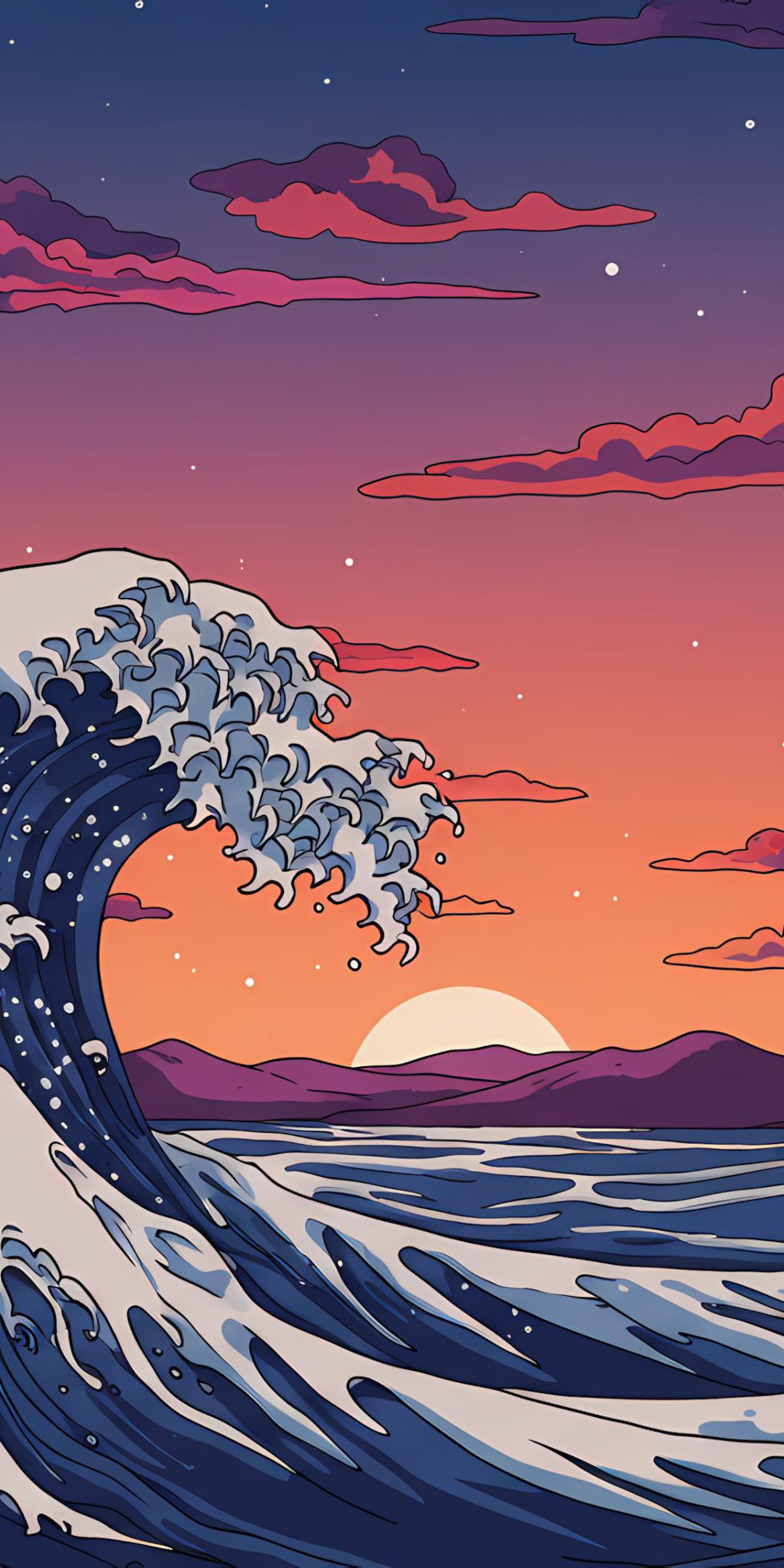 Ocean Wave Sunset Clouds Art Wallpaper - 1080x2160