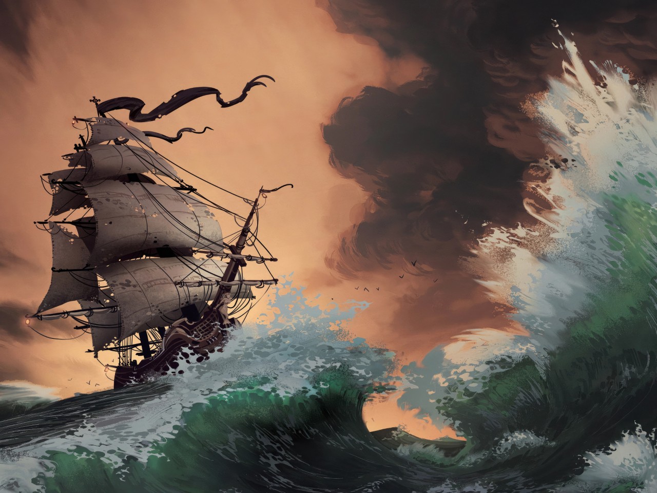 Ocean Waves Pirate Ship Painting Wallpaper - 1280x960