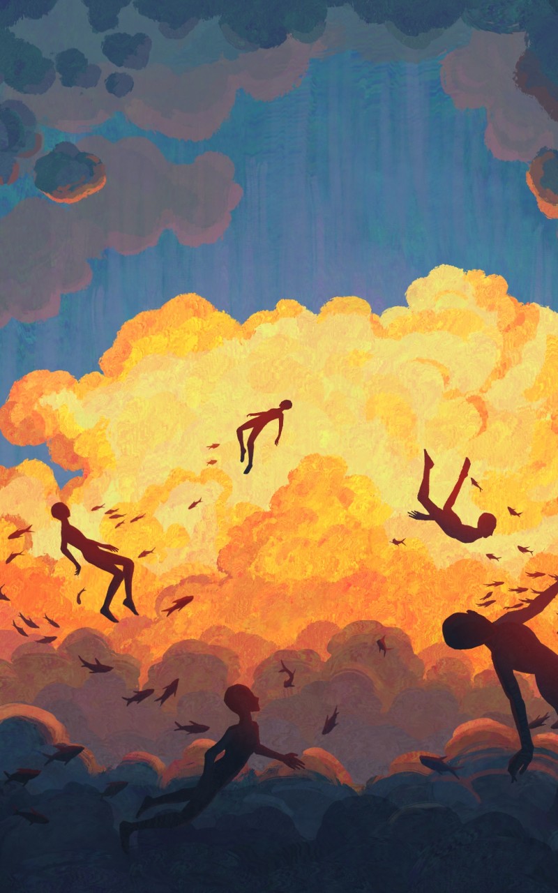 Orange Clouds Floating People Art Wallpaper - 800x1280