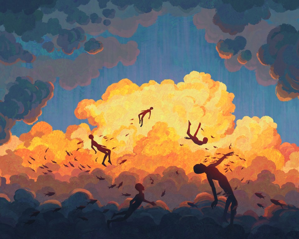 Orange Clouds Floating People Art Wallpaper - 960x768