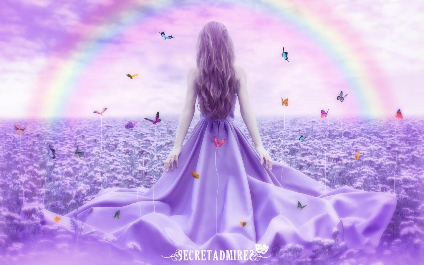 Purple Flowers Rainbow Bbutterfly Girl Wallpaper - 1440x900