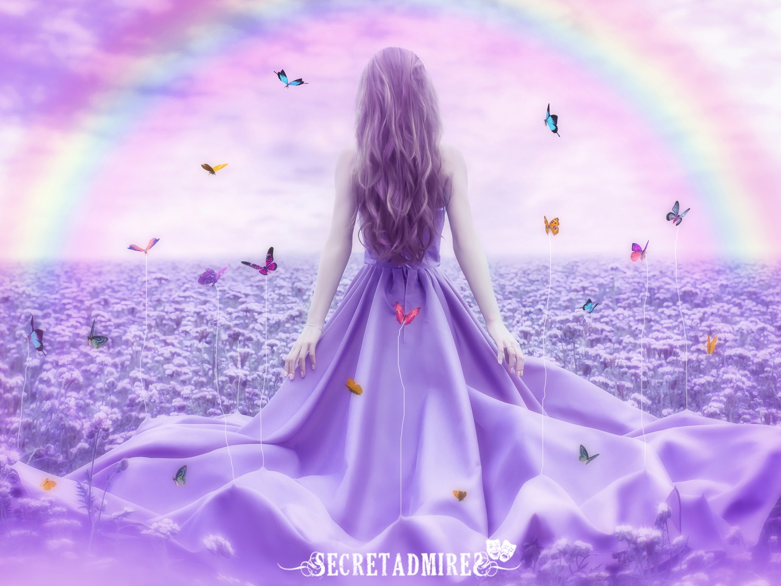 Purple Flowers Rainbow Bbutterfly Girl Wallpaper - 1600x1200