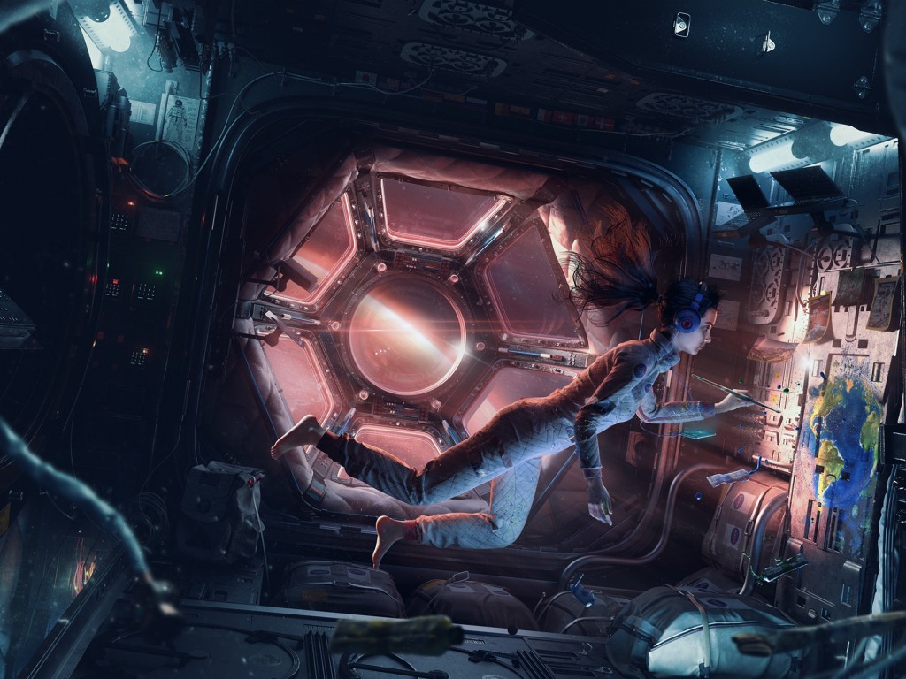 Space Astronaut Girl Earth Painting Wallpaper - 1024x768