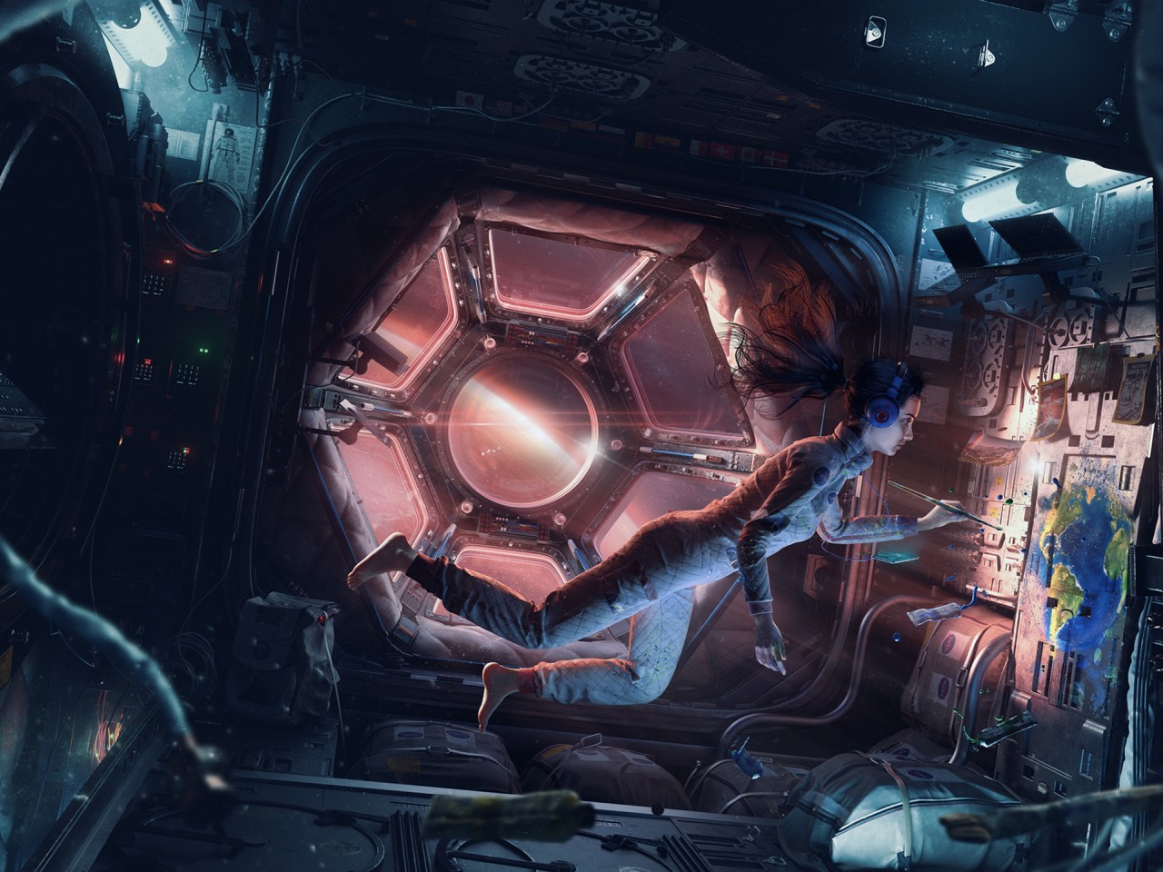 Space Astronaut Girl Earth Painting Wallpaper - 1280x960