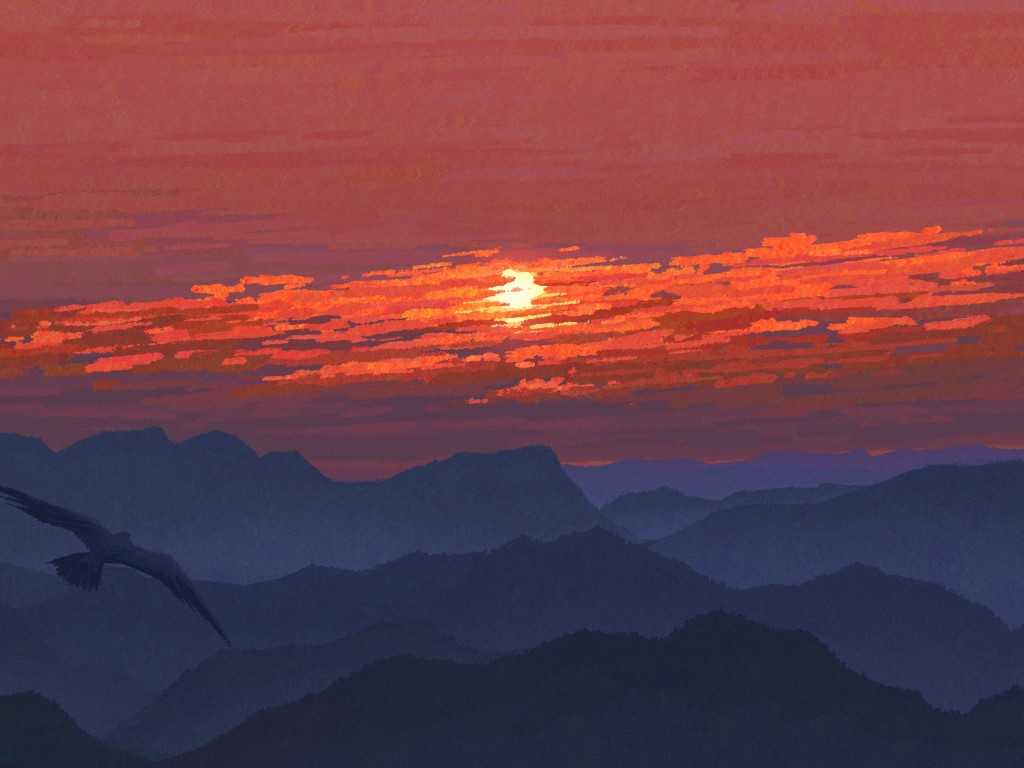 Sunset Mountains Bird Red Sky Art Wallpaper - 1024x768
