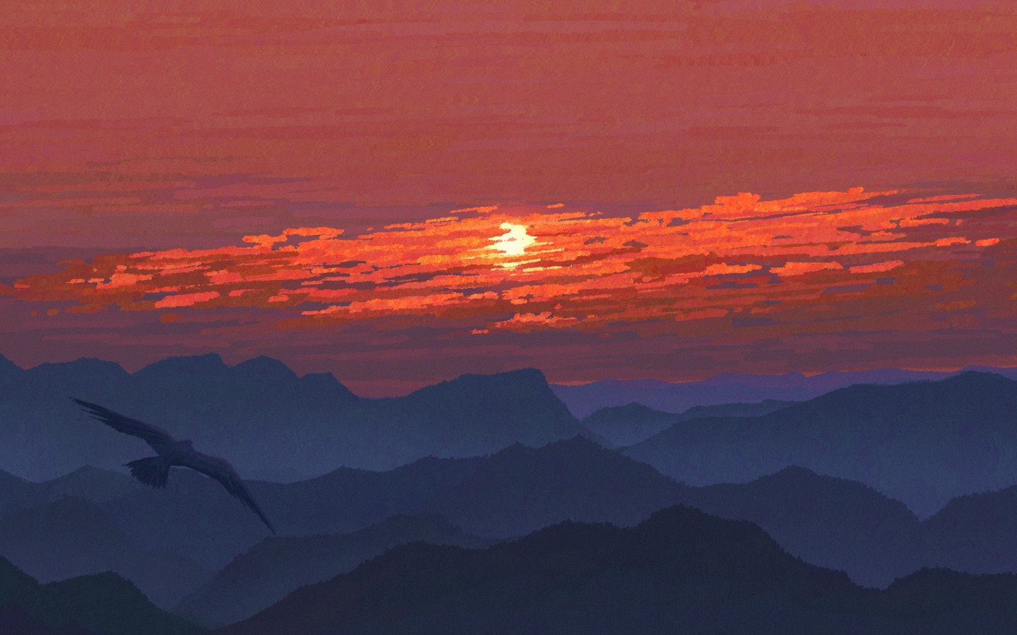 Sunset Mountains Bird Red Sky Art Wallpaper - 1440x900