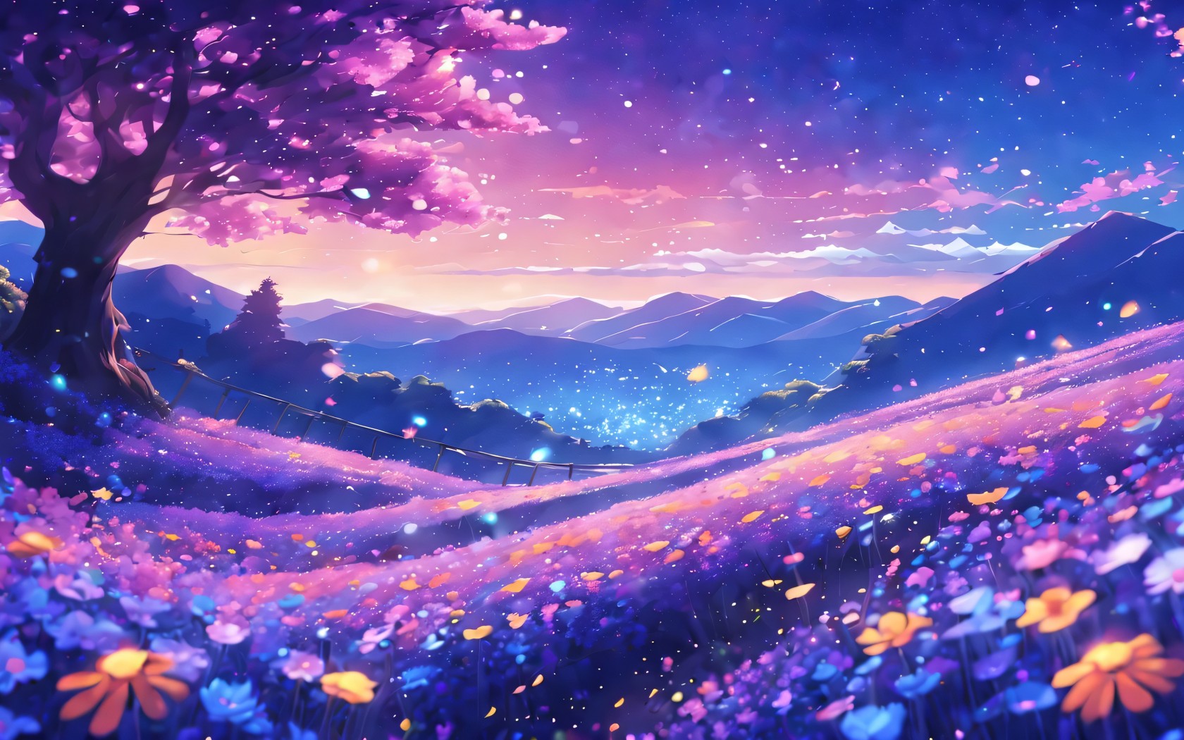 Tree Purple Flower Field Ai Art Wallpaper - 1680x1050