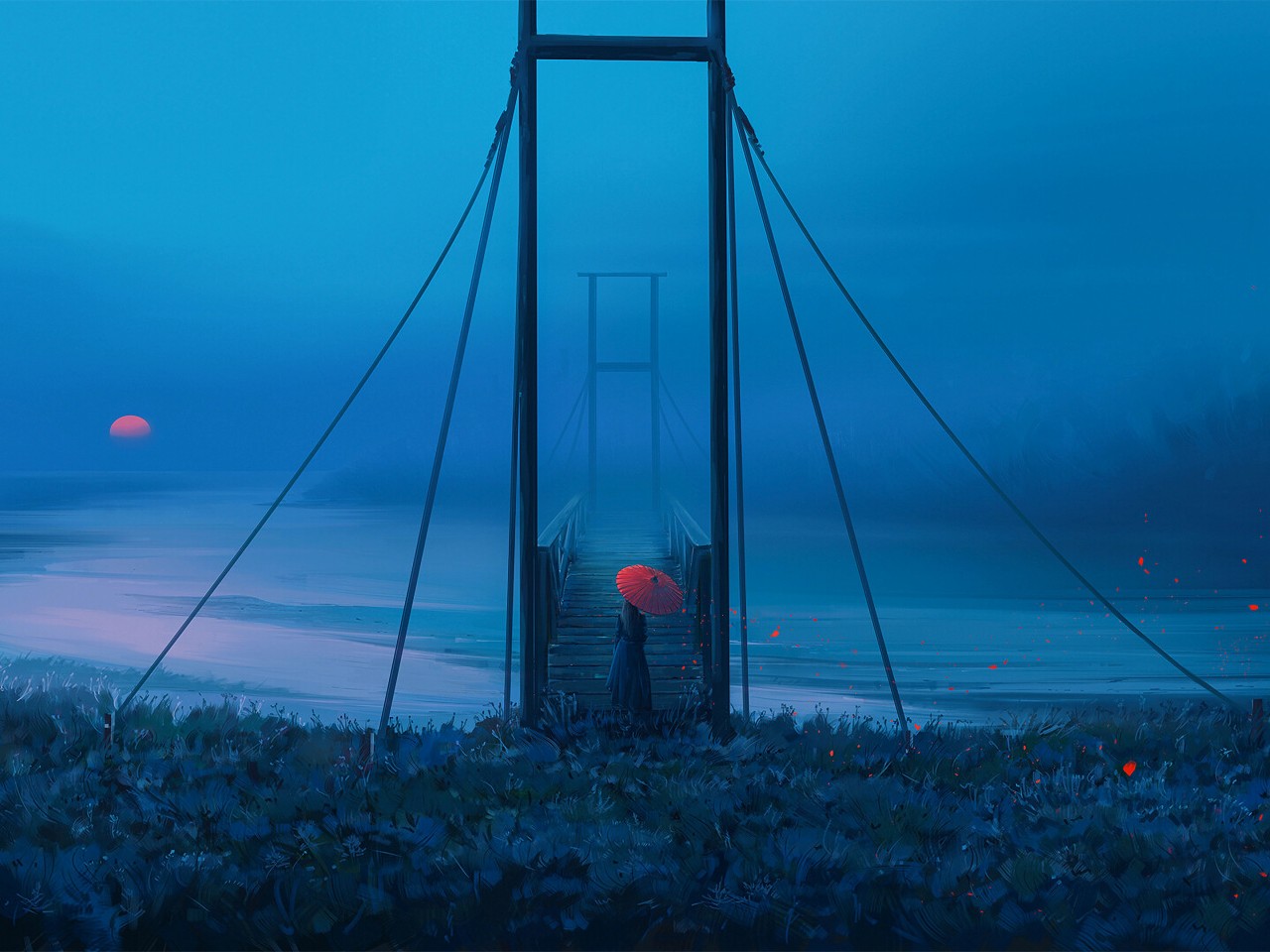 Women Umbrella Bridge Blue River Wallpaper - 1280x960