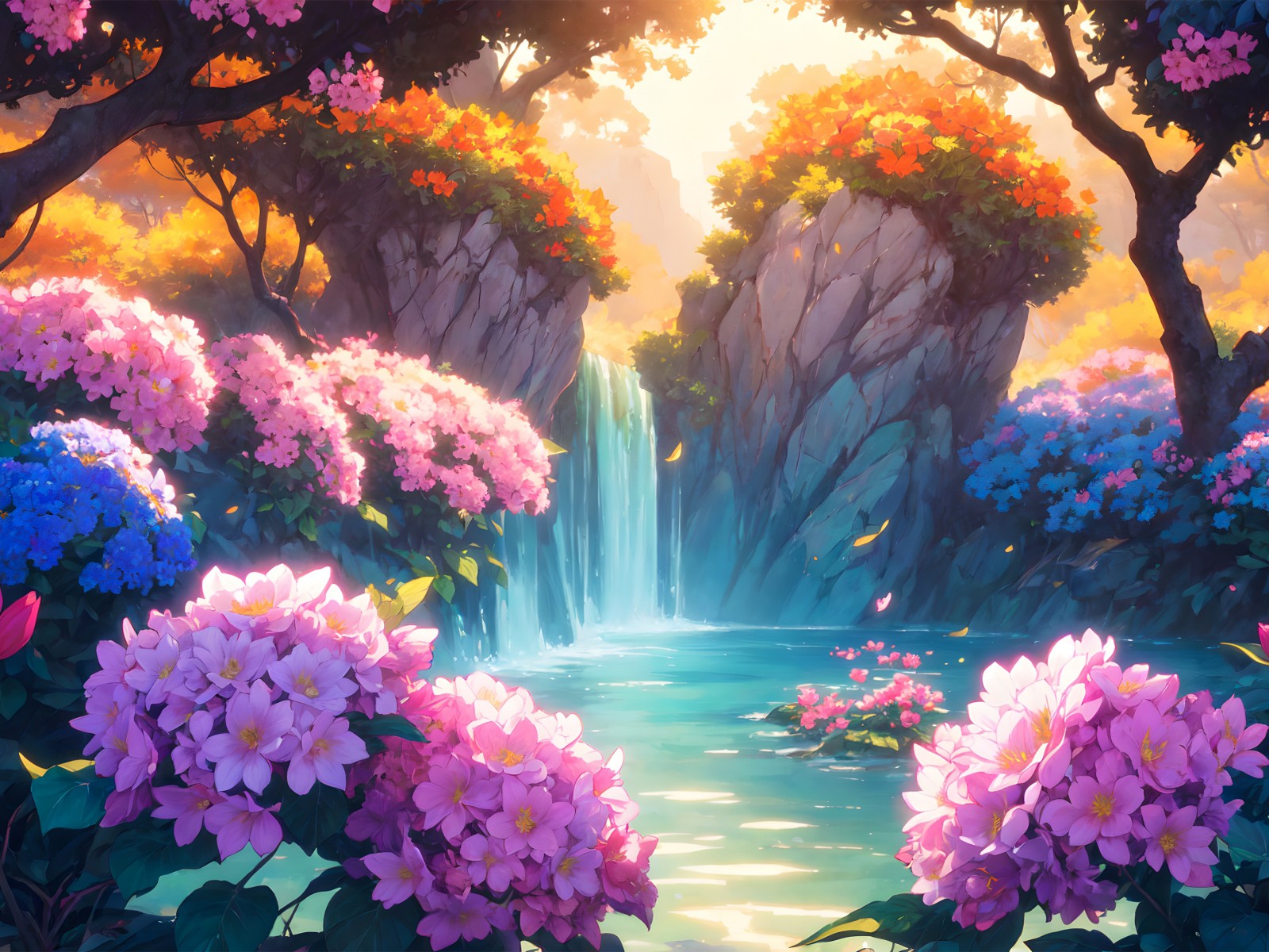 Colorful Flowers Trees Waterfall Scene Wallpaper - 1600x1200