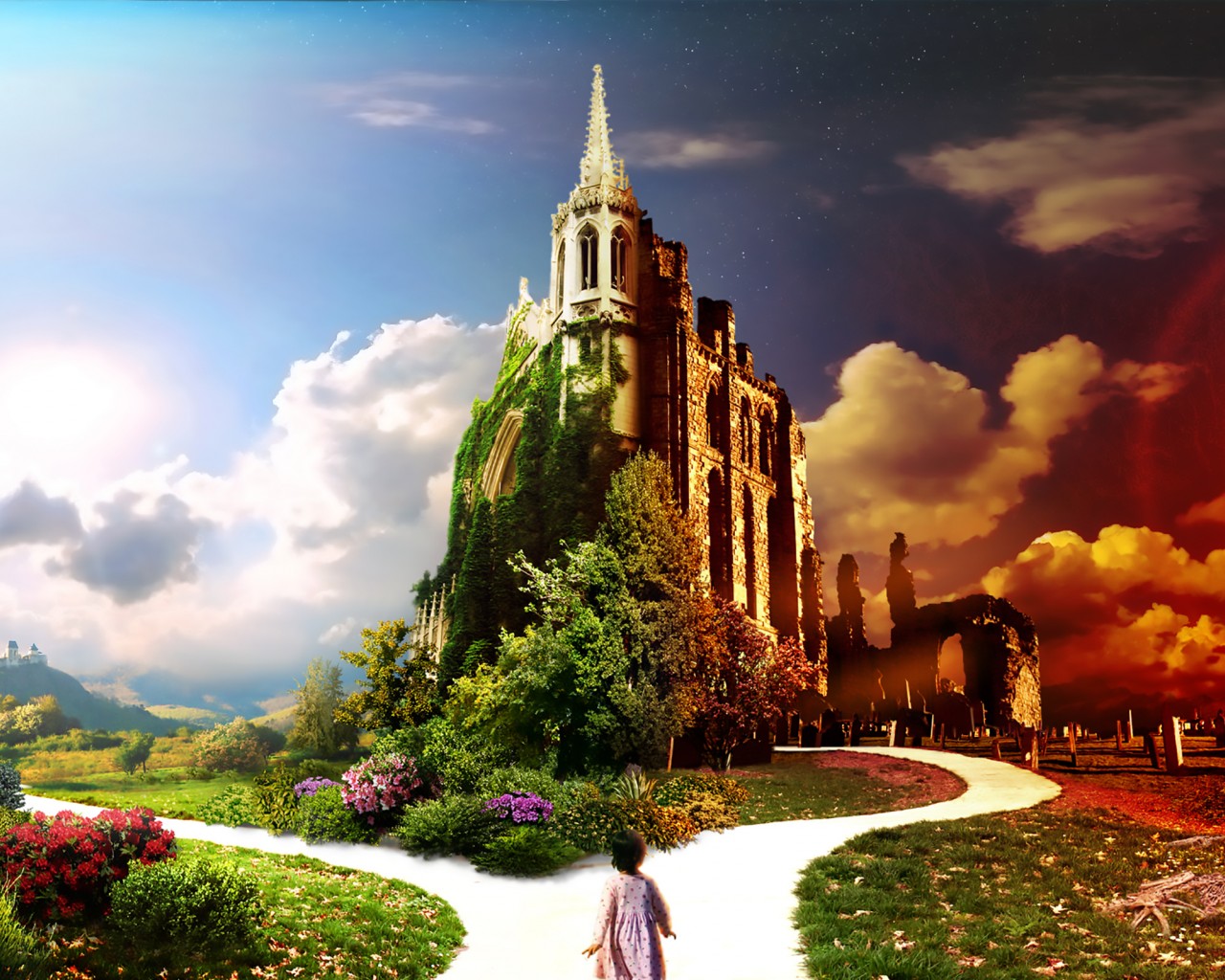 Split Road Castle Paradise Wallpaper - 1280x1024