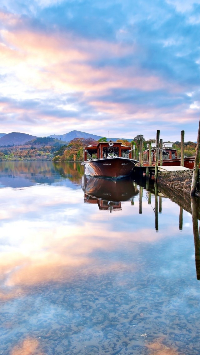 Lake Boat Dock Sky Reflection Wallpaper - 640x1136
