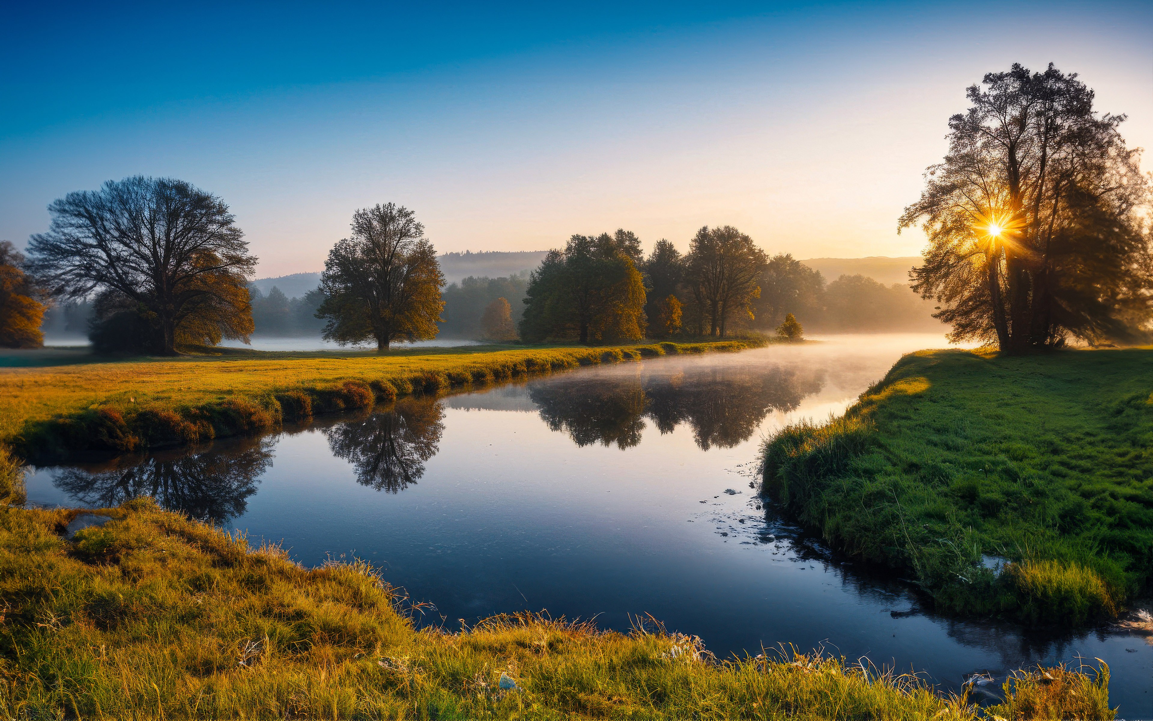 Download Morning Fog Trees Sun River Wallpaper Optimized for Desktop, Tablet and Mobile Devices.